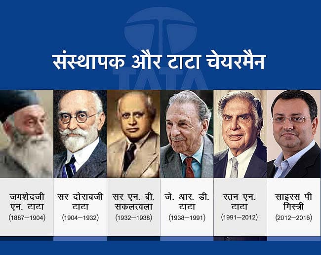 साइरस मिस्त्री के काम से नाखुश टाटा संस ने बड़ा फैसला लेते हुए उन्हें चेयरैमन के पद से हटा दिया. महज चार साल के भीतर वह पद से हटा दिए गए. टाटा ग्रुप ने 148 साल में महज 6 चेयरमैन देखे. दो बार को छोड़ दें तो टाटा परिवार से ही चेयरमैन बने हैं. टाटा परिवार में चूंकि ज्यादातर लोगों ने शादी नहीं की इसलिए उत्तराधिकारी चुनने में ज्यादा दिक्कत होती है. इन समूह के सभी छह चेयरमैनों पर आइए डालें एक नजर :
