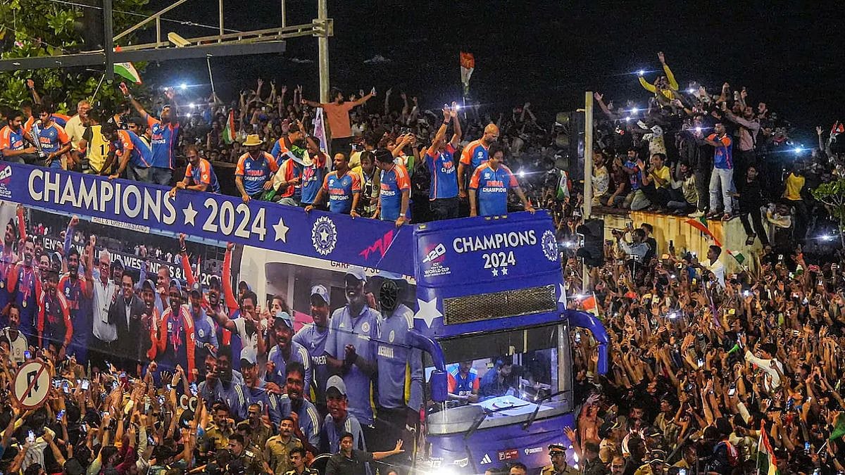 विक्ट्री परेड के दौरान मुंबई की सड़कों पर जनसैलाब उमड़ पड़ा. क्रिकेट फैंस ने पूरी टीम का हौसला बढ़ाया और समर्थन में नारे लगाए. हर खिलाड़ी एक के बाद एक बस की फ्रंट रो में आया और फैंस का इस्तेकबाल कबूल किया.